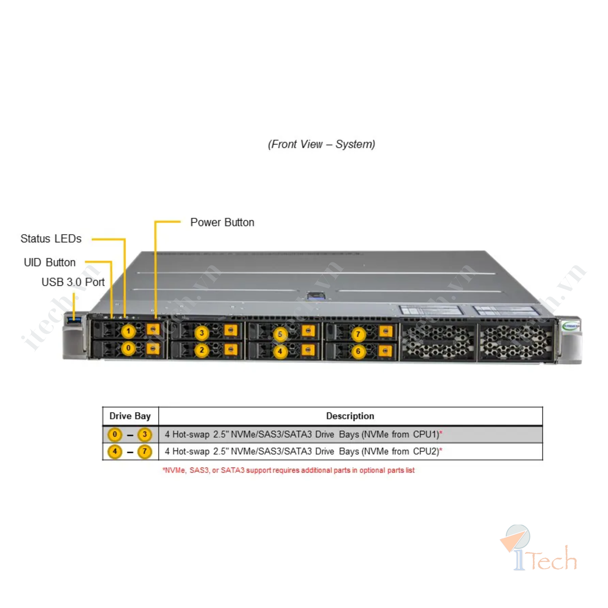 | - Drive Bays Configuration | Default: 8 front hot-swap 2.5" NVMe/SAS/SATA drive bays; Option A: 12 front hot-swap 2.5" NVMe/SAS/SATA drive bays |